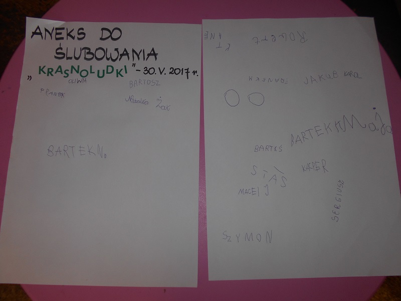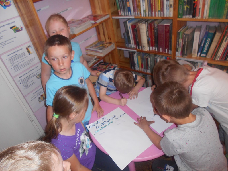 Po takim wprowadzeniu przyszli czytelnicy złożyli uroczyste przyrzeczenie, że zawsze będą szanować książki, po czym następiło uroczyste pasowanie na czytlników . Już jako czytelnicy biblioteki podpisali się pod przysięgą, a pamiątkowy dyplom będzie im przypominał o tym uroczystym wydarzeniu.